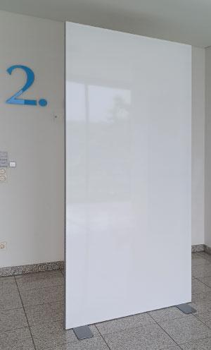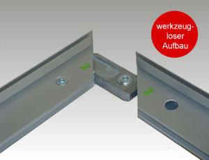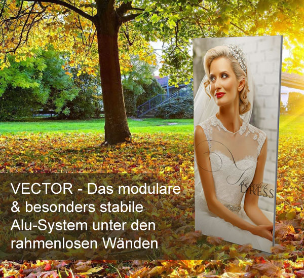 Dieses Wandsystem ist so stabil, dass es nicht nur mit Stoff bespannt werden kann, sondern auch klare oder milchig weiße Acryl- oder laminierte PVC-Platten rahmenlos aufnehmen kann. Und das nicht nur ein-, sondern auch beidseitig.