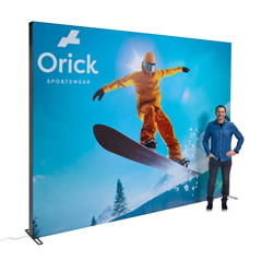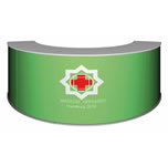 leichte Alternative dieser Lamellentheken kommt ohne Lamellenummantelung aus. Stattdessen drucken wir die Grafik auf einer flexiblen PVC-Bahn, die dann um die Theke gelegt wird oder wir liefern Ihnen eine farbige Ummantelung mit textiler Oberfläche mit. Boden und Deckplatte dieser Messetheke sind mit einem Gestänge verbunden. Die Formen dieser Theken entsprechen denen der Lamellentheken, sie sind aber leichter und halten nicht so große Auflagegewichte.